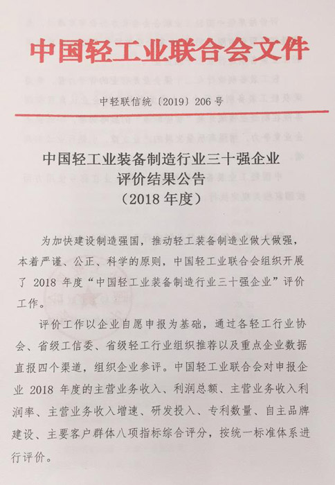 為加快建設(shè)強國,推動輕工裝備制造業(yè)做大做強,本著嚴謹、公正、科學的原則,中國輕工業(yè)聯(lián)合會組織開展了2018年度“中國輕工業(yè)裝備制造行業(yè)三十強企業(yè)”、“中國輕工業(yè)科技百強企業(yè)”評價工作。