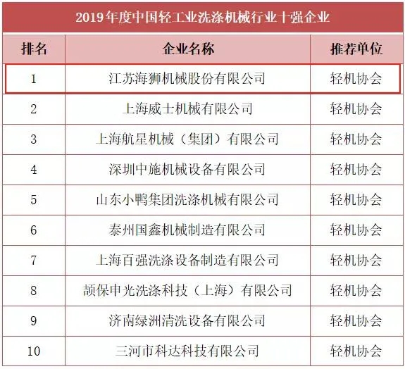 由中國(guó)輕工機(jī)械協(xié)會(huì)推薦,與中國(guó)輕工業(yè)聯(lián)合會(huì)共同評(píng)選出2019年度中國(guó)輕工業(yè)洗滌機(jī)械行業(yè)十強(qiáng)企業(yè),海獅機(jī)械排名第1位。